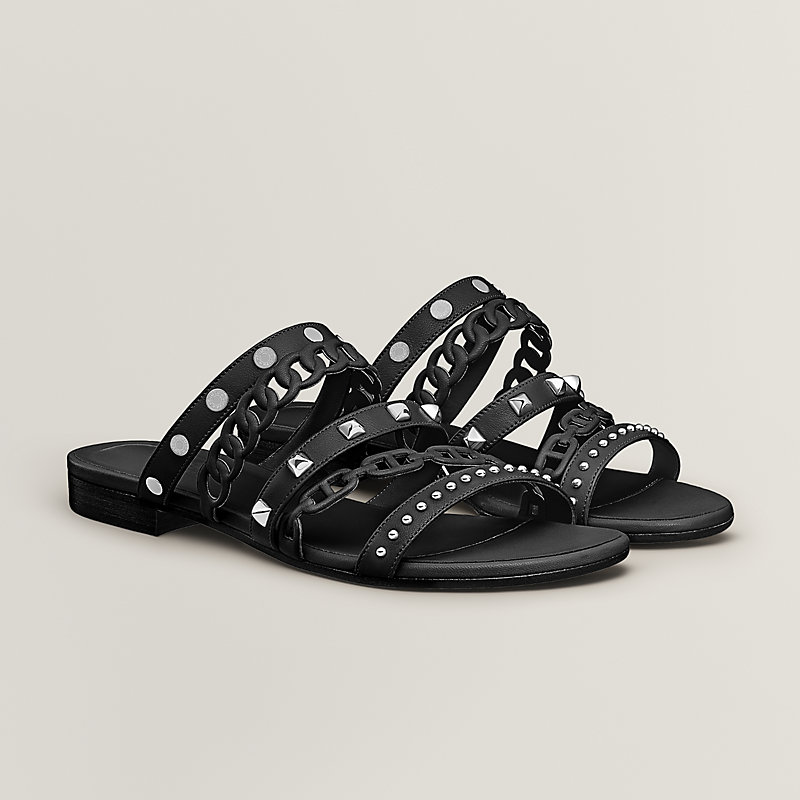 Alternance de brides et chaînes sur ces sandales en nappa et clous palladiés