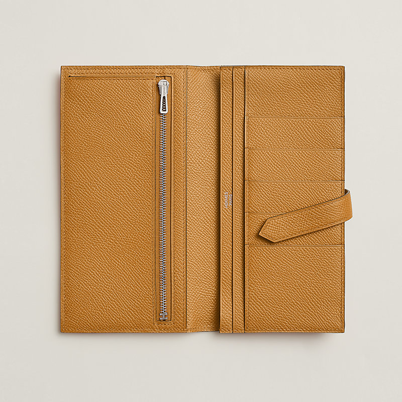 Wallet with gusset in Epsom calfskin with 5 credit card slots, 2 pockets, zipped change purse and palladium plated 'H' tab closure