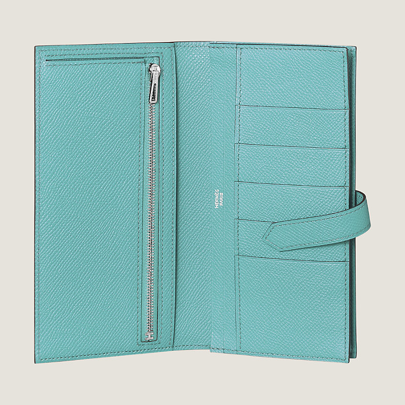 Wallet with gusset in Epsom calfskin with 5 credit card slots, 2 pockets, zipped change purse and palladium plated 'H' tab closure