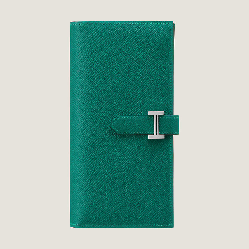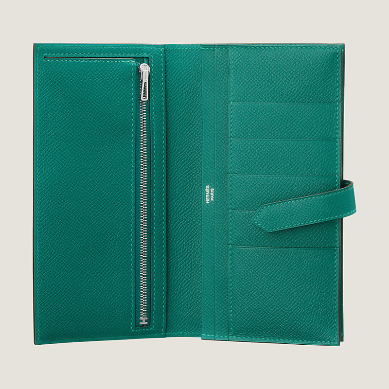 Wallet with gusset in Epsom calfskin with 5 credit card slots, 2 pockets, zipped change purse and palladium plated 'H' tab closure
