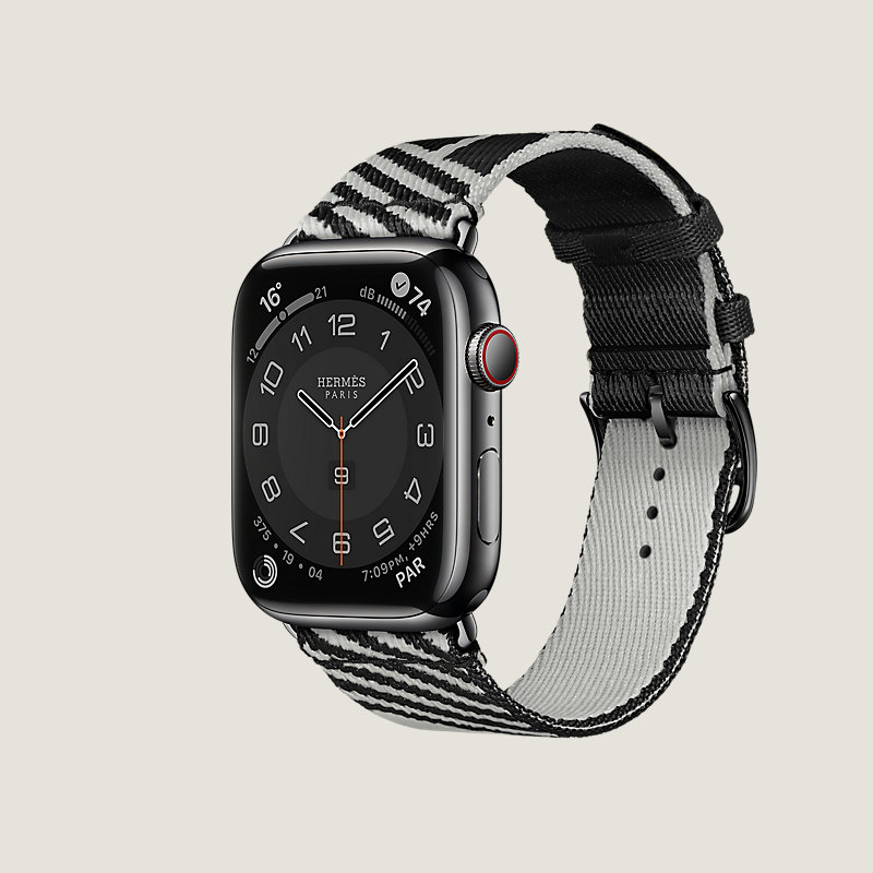 Apple Watch Hermès Series 8 case in Space Black stainless steel 45 mm & Single tour band in Noir/Gris Clair nylon weave, "H Vibration" motif