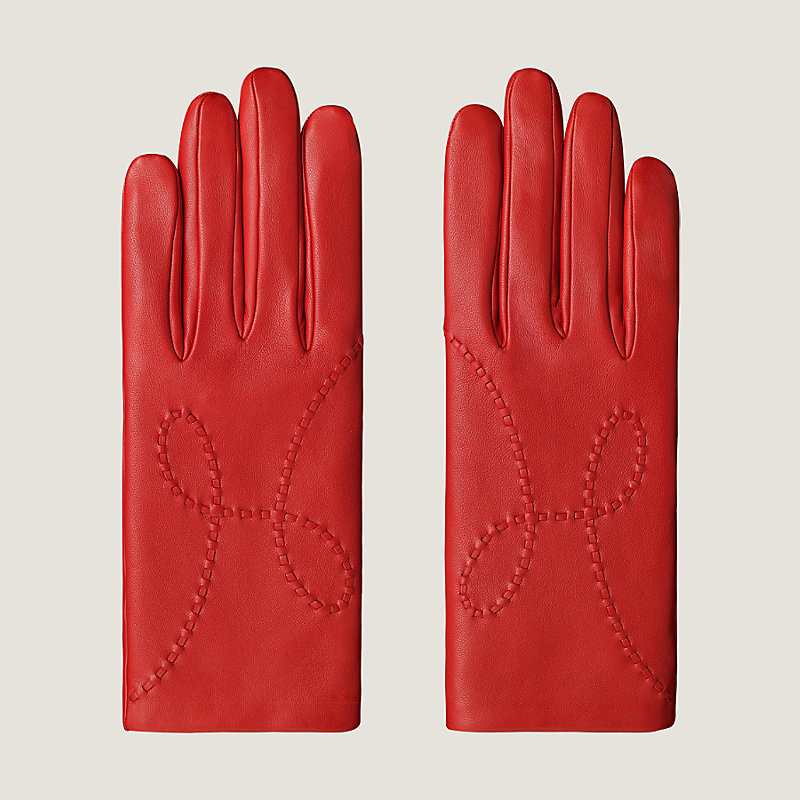 Hermes gloves in glossed lambskin with subtle H signature and silk lining.
