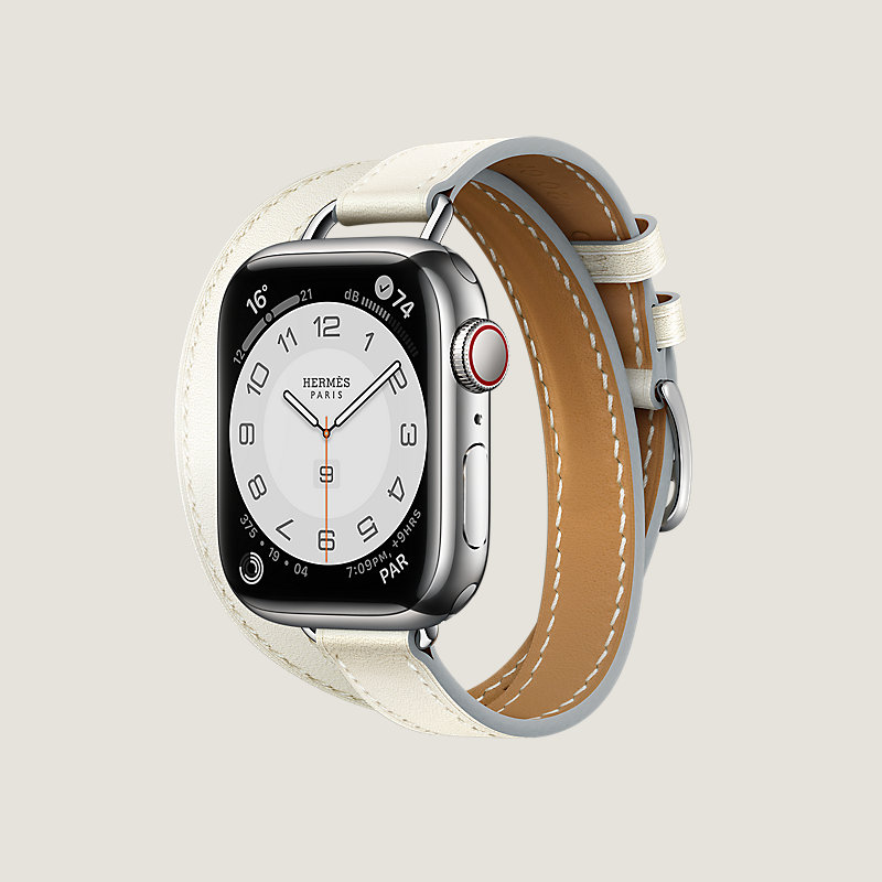 Apple Watch Hermès Series 8 case in stainless steel 41 mm & Double tour band in Blanc Swift calfskin