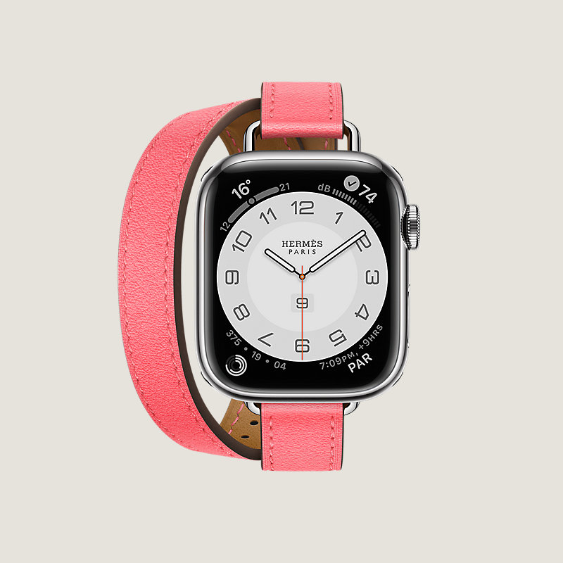Apple Watch Hermès Series 8 case in stainless steel 41 mm & Double tour band in Rose Azalee Swift calfskin