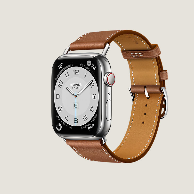 Apple Watch Hermès Series 8 case in stainless steel 45 mm & Single tour band in Fauve Barenia calfskin
