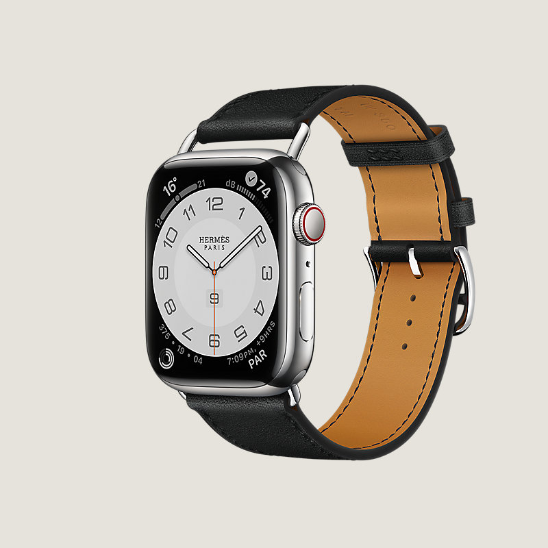 Apple Watch Hermès Series 8 case in stainless steel 45 mm & Single tour band in Noir Swift calfskin