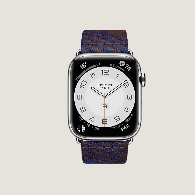 Apple Watch Hermès Series 8 case in stainless steel 45 mm & Single tour band in Rouge Sellier/Bleu Saphir nylon weave, "H Vibration" motif