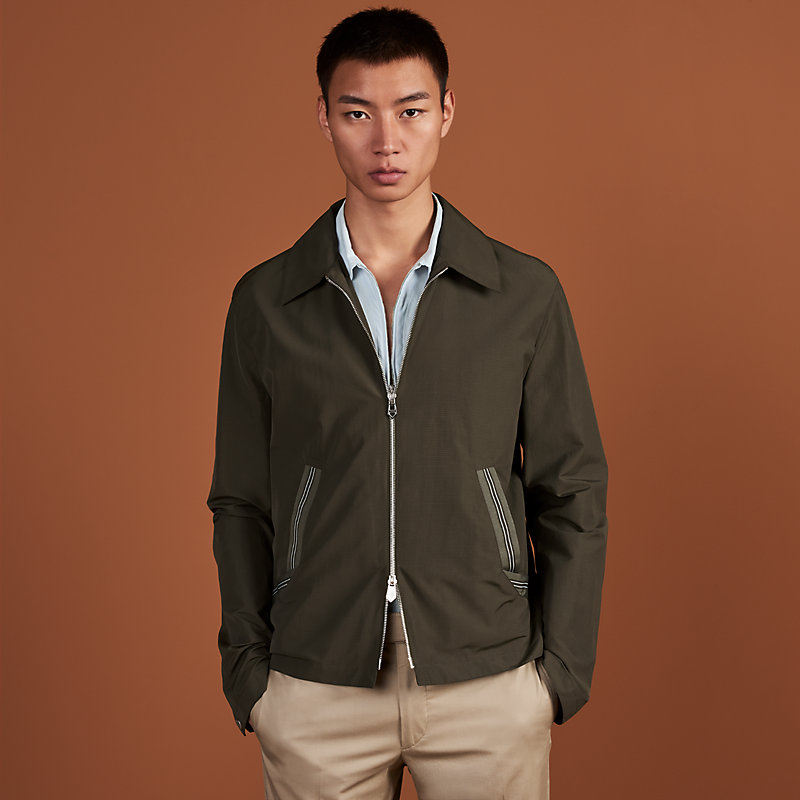 Straight cut zipped jacket in water repellent weave with twisted ribbon (50% cotton and 50% polyester)