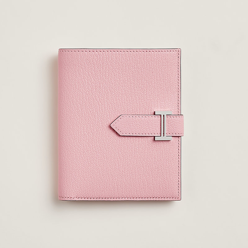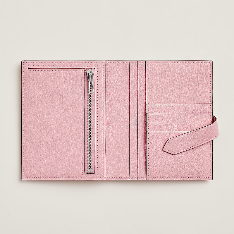 Compact wallet in Mysore goatskin with 4 credit card slots, 2 pockets, zipped change purse and palladium plated 'H' tab closure
