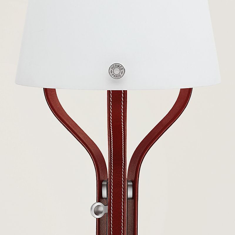 Bedside lamp covered with smooth taurillon leather, lampshade supported by three leather arms. Stands on a base which could also be used as a change tray. Diffuse lighting. Dimmer to adjust light intensity