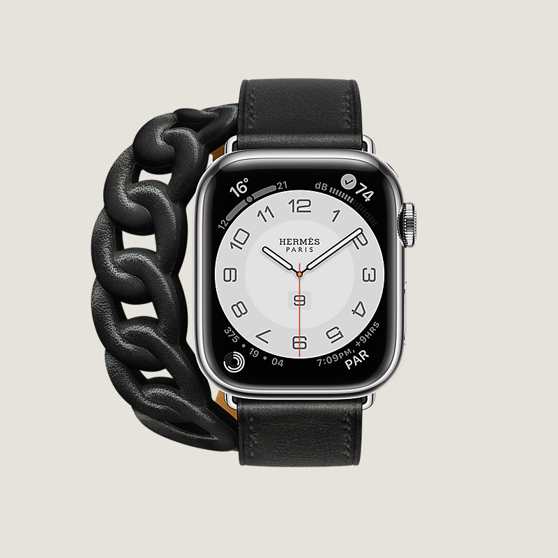 Apple Watch Hermès Series 8 case in stainless steel 41 mm & Double tour band in Noir Swift calfskin