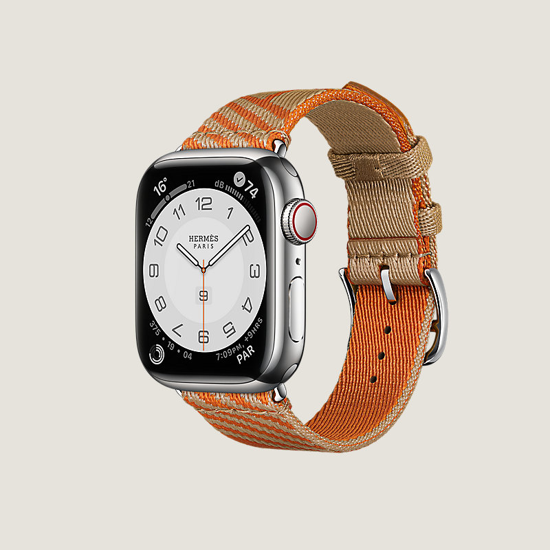 Apple Watch Hermès Series 8 case in stainless steel 41 mm & Single tour band in Kraft/Orange nylon weave, "H Vibration" motif