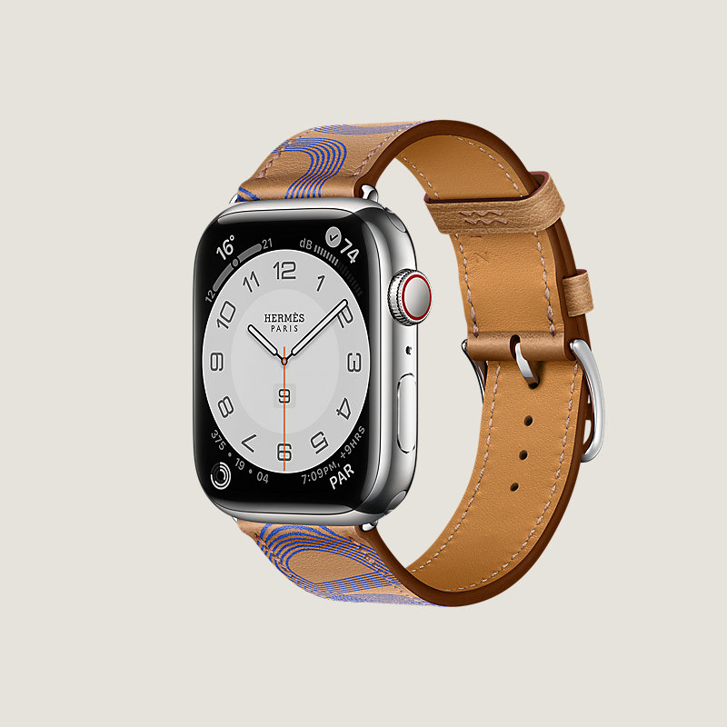 Apple Watch Hermes Series 7 case in stainless steel 45 mm & Single tour band in Biscuit/Bleu Electrique Swift calfskin, "Circuit 24" print