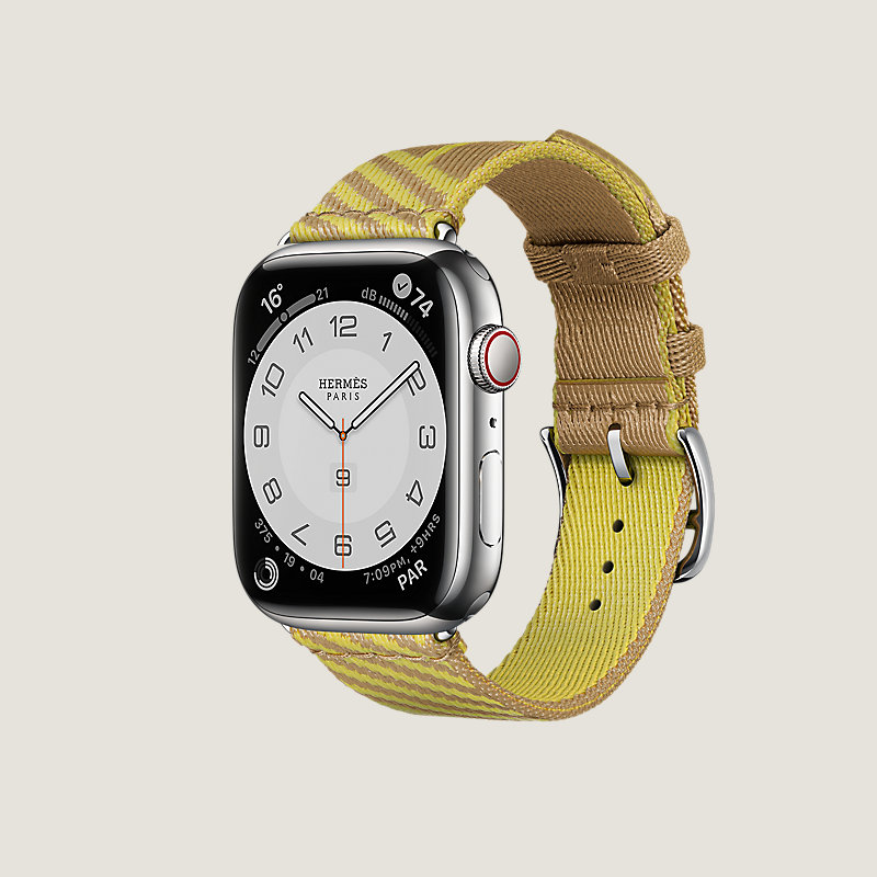 Apple Watch Hermes Series 7 case in stainless steel 45 mm & Single tour band in Kraft/Lime nylon weave, "H Vibration" motif