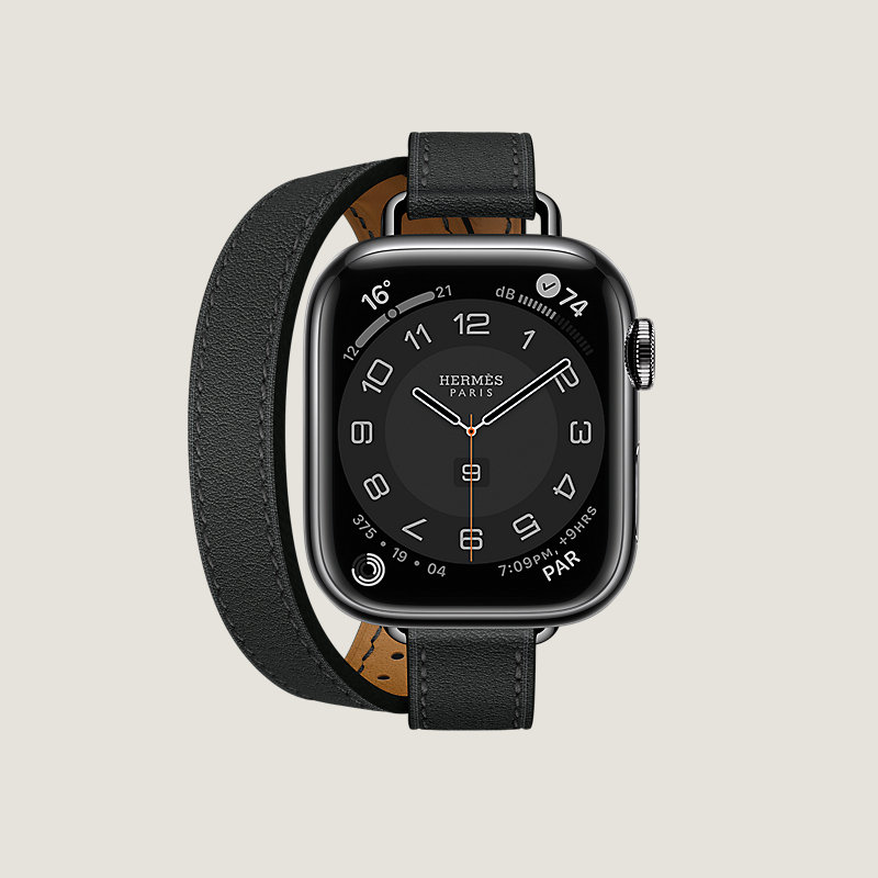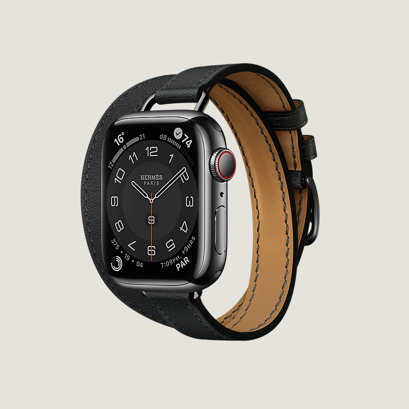 Apple Watch Hermes Series 7 case in space black stainless steel 41 mm & Double tour band in Noir Swift calfskin