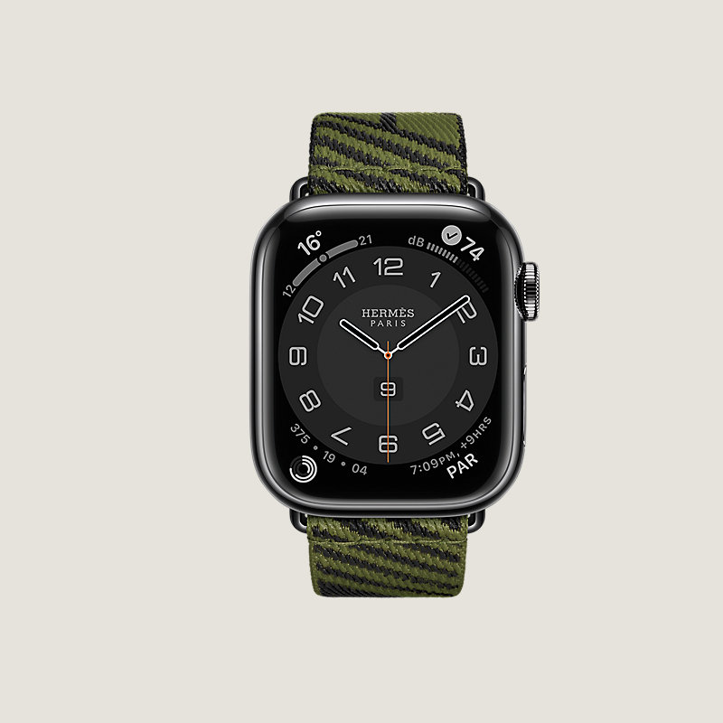 Apple Watch Hermes Series 7 case in space black stainless steel 41 mm & Single tour band in Vert Véronèse/Noir nylon weave, "H Vibration" motif