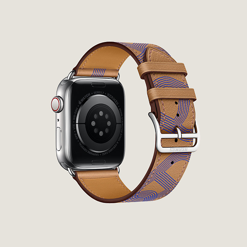 餅乾色/電光藍Swift小牛皮單圈錶帶,"Circuit 24"圖紋印花。