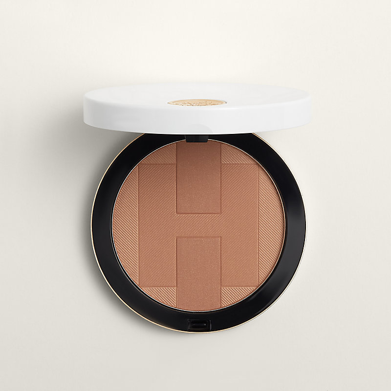 由Pierre Hardy設計的圓形粉餅盒猶如一個煥發白色和金色光芒的圓盤,具有造型大方的特色。粉底質地緊實,帶有仿如真絲斜紋面料般的細小條紋,表面呈現愛馬仕的經典圖案:貫穿的H字母。這一帶有裝飾藝術風格的幾何式經典標記誕生於1920年代中期,原是為身為鞍具製造商的愛馬仕專門創作。美觀的H圖案亦獨具功能性,將三種色調融為一體又加以區分,其垂直字母部分為暗色調,而底部則為淺色調。
