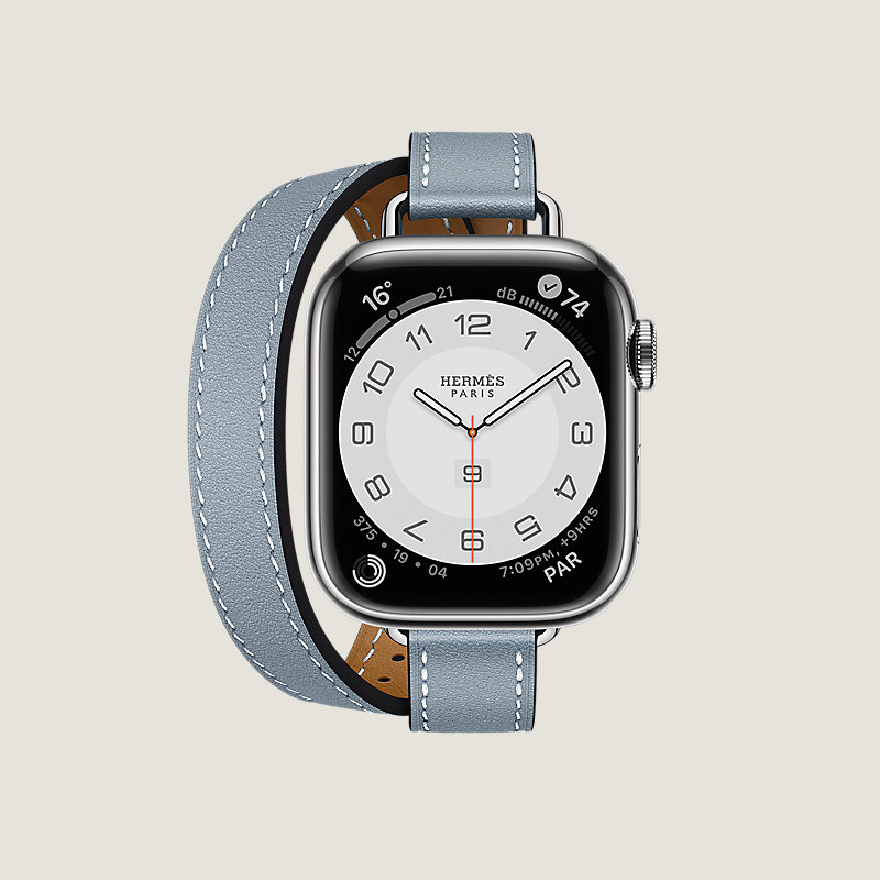 Apple Watch Hermès Series 8 case in stainless steel 41 mm & Double tour band in Bleu Lin Swift calfskin