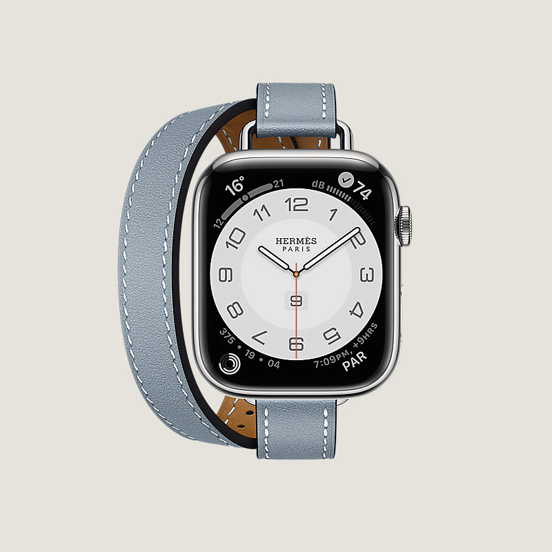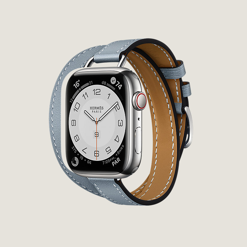 Apple Watch Hermes Series 7 case in stainless steel 45 mm & Double tour band in Bleu Lin Swift calfskin