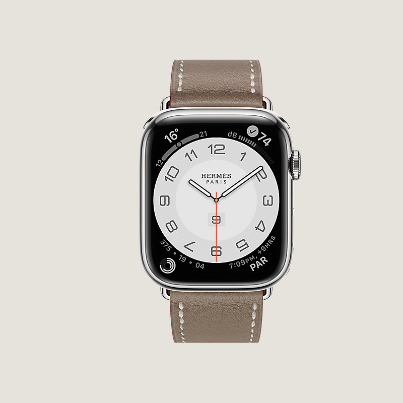 Apple Watch Hermes Series 7 case in stainless steel 45 mm & Single tour band in Etoupe Swift calfskin