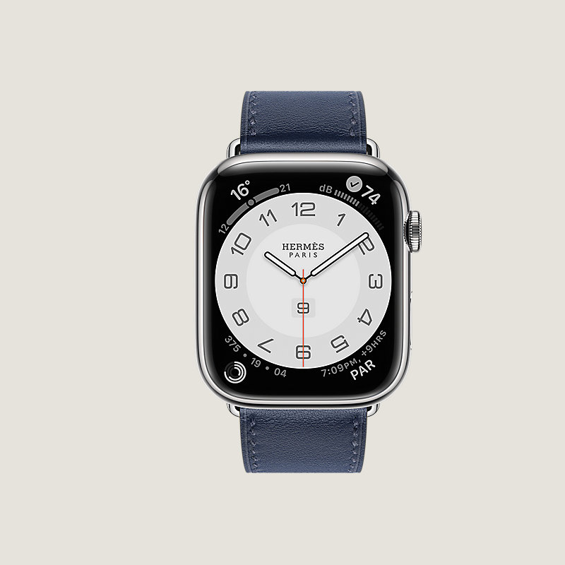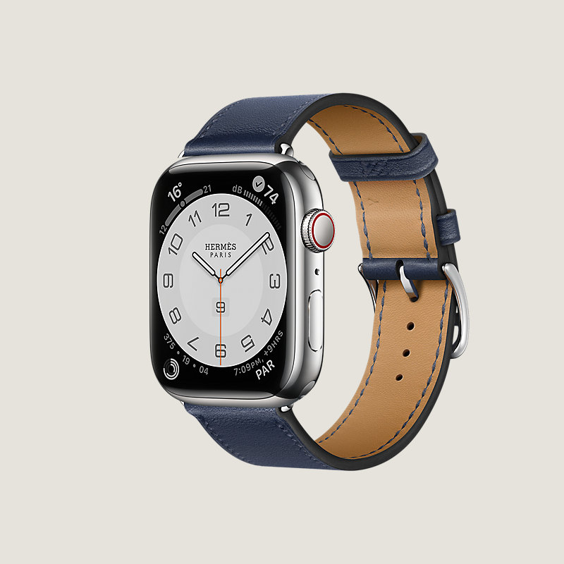 Apple Watch Hermes Series 7 case in stainless steel 45 mm & Single tour band in Navy Swift calfskin