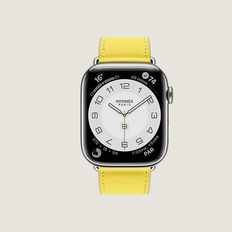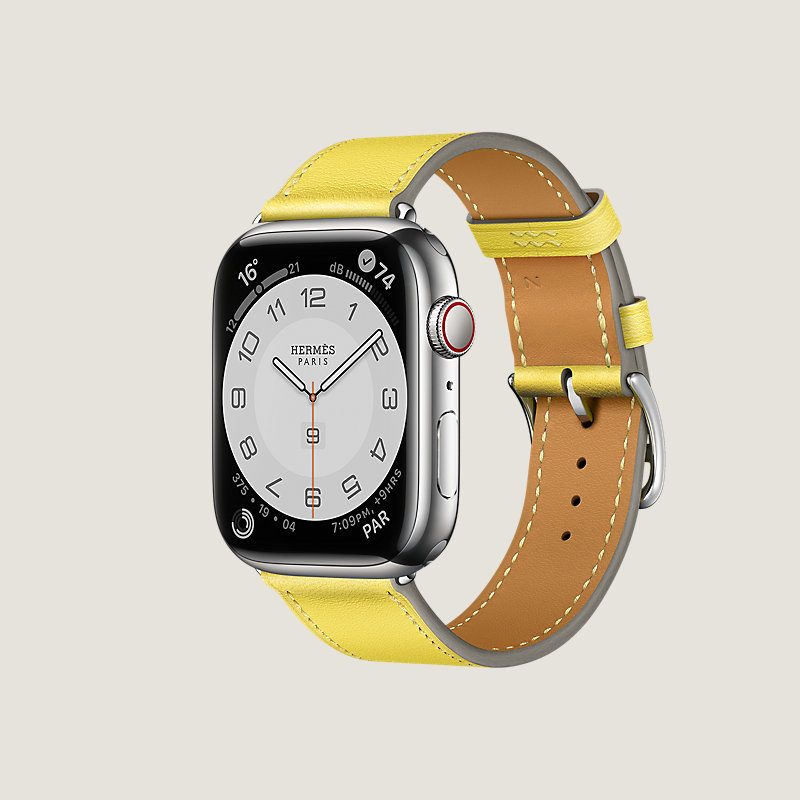 Apple Watch Hermes Series 7 case in stainless steel 45 mm & Single tour band in Lime Swift calfskin