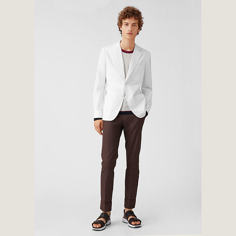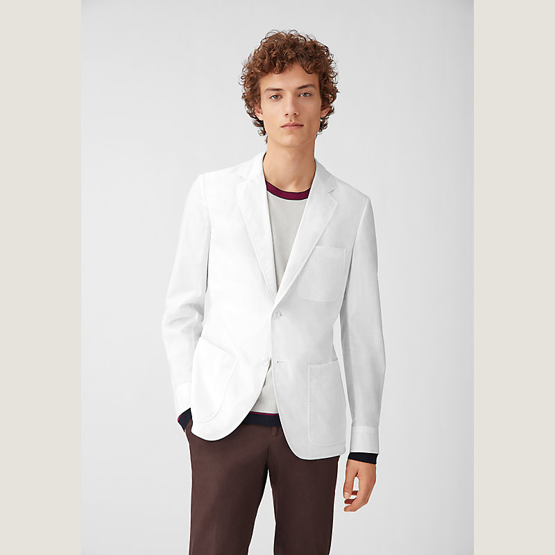 Hermes two-button jacket in crisp cotton poplin, notched collar, shirt-style cuffs, three front pockets, unlined (100% cotton)
