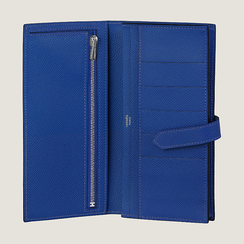 Wallet with gusset in Epsom calfskin with 5 credit card slots, 2 pockets, zipped change purse and palladium plated 'H' tab closure