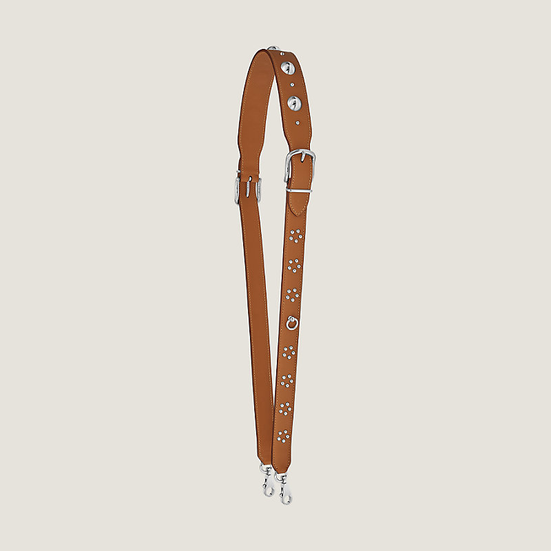 Bag strap in Swift calfskin with studs with palladium plated hardware, large snap hook. Center piece is removable to allow more adjustments.