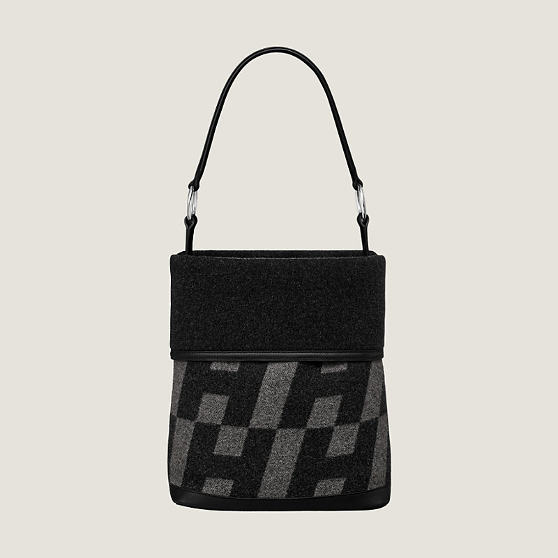 Bag in crosswise H weave canvas, Swift calfskin and Hunter cowhide, thin handle held by silver and palladium plated bridle rings