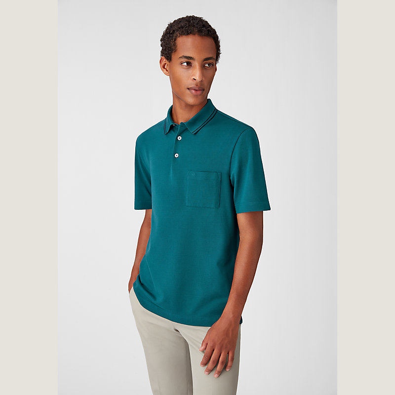 Hermes short sleeve polo shirt in cotton jersey, one front pocket, contrasting striped collar (100% cotton)