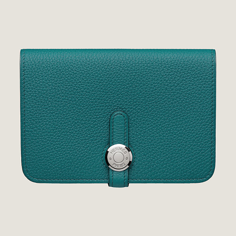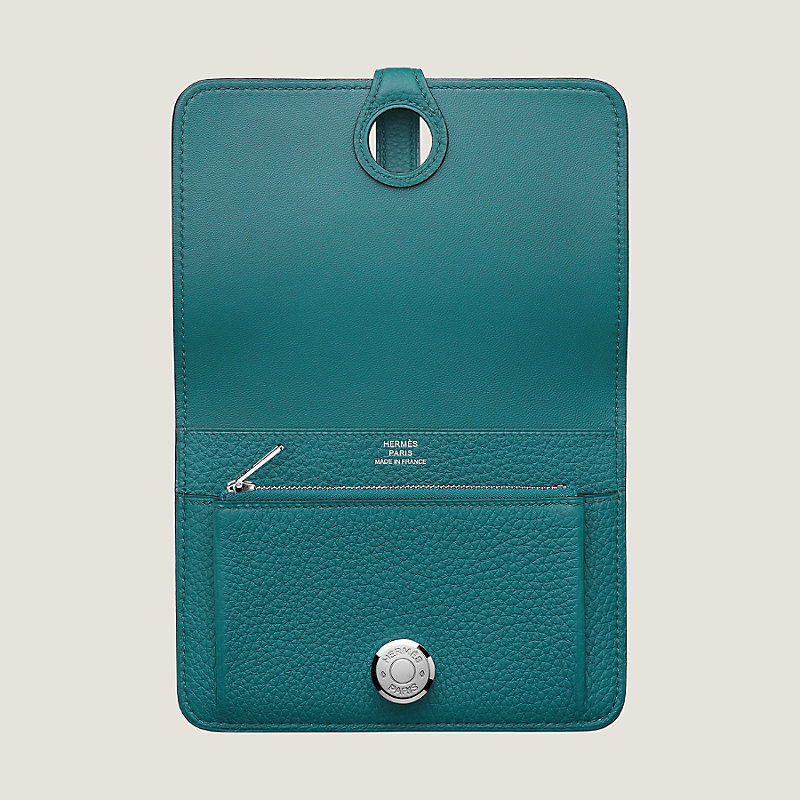 Compact wallet in Togo calfskin with 2 credit card slots under flap, 1 credit card slot inside, zipped pouch and palladium plated Clou de Selle closure