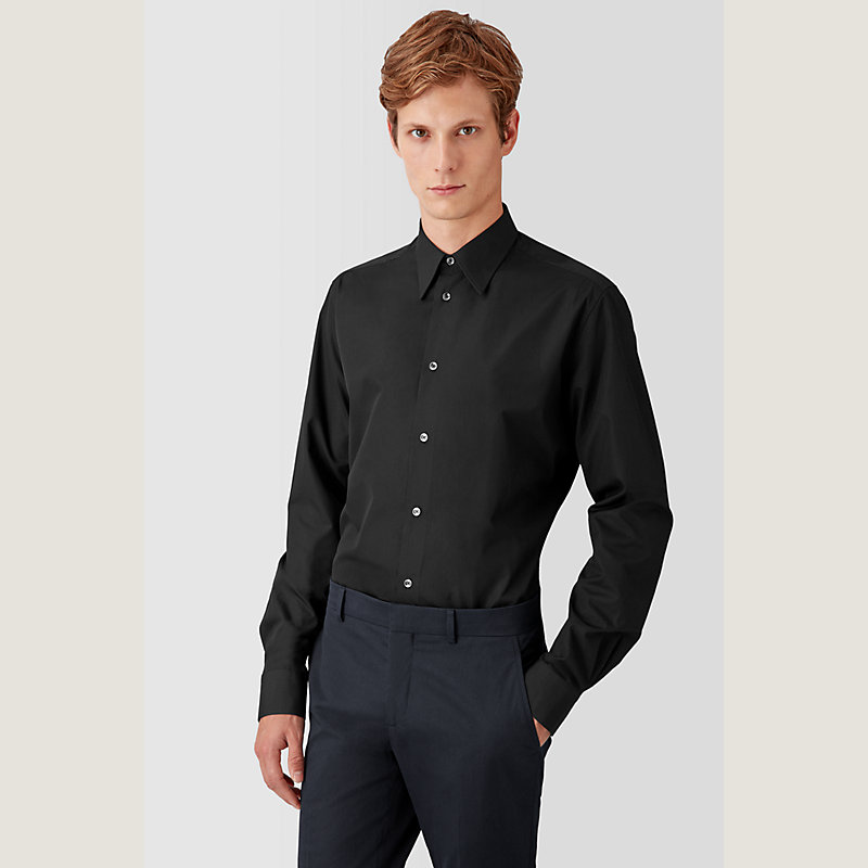 Our dress shirt in luxurious, cotton poplin. Fitted body is cut for a tapered silhouette. With pure mother of pearl buttons and box pleat placket. Barrel cuff with signature "Clou de Selle" button in palladium.