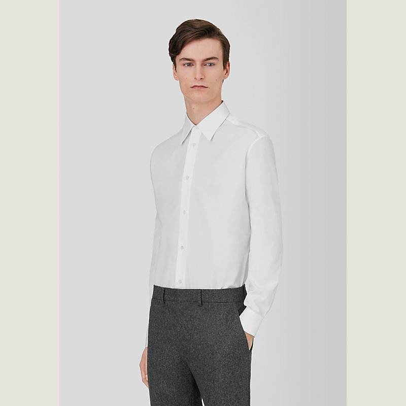 Our dress shirt in luxurious, cotton poplin. Fitted body is cut for a tapered silhouette. With pure mother of pearl buttons and box pleat placket. Barrel cuff with signature "Clou de Selle" button in palladium.