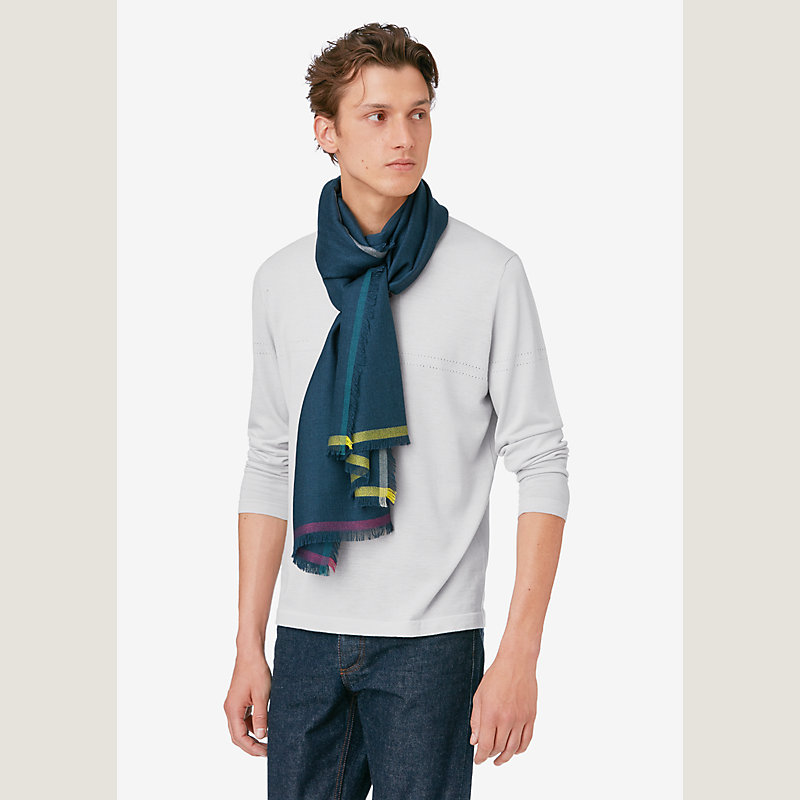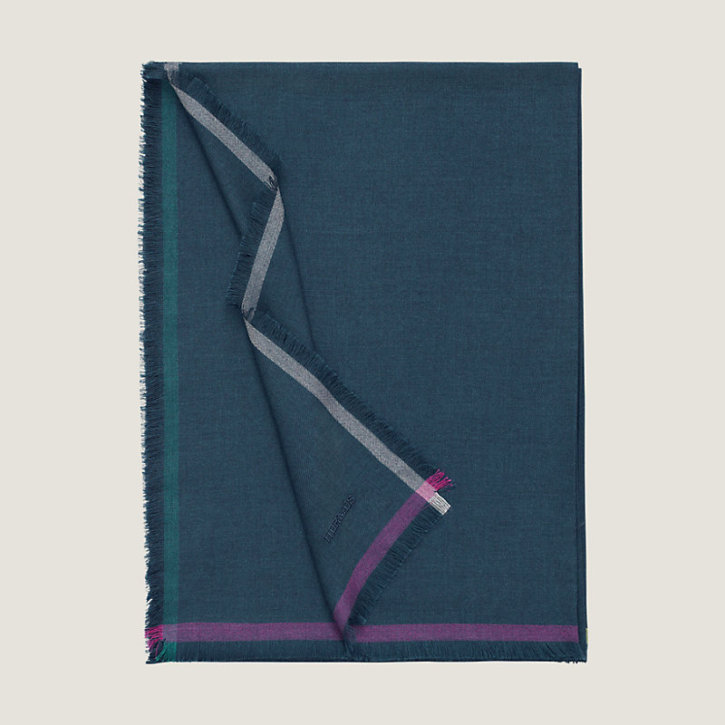 Lightweight cashmere and silk muffler with contrasting borders, fringed on all four sides.
