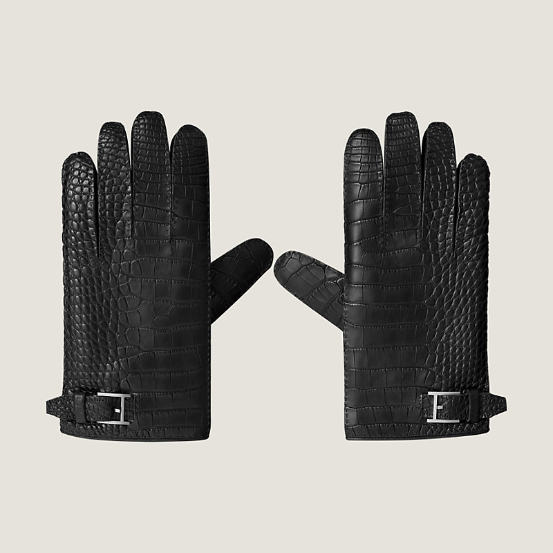 Hermes men's bimaterial gloves in alligator and glossed lambskin with silk lining, brushed palladium plated metal and James belt finishings