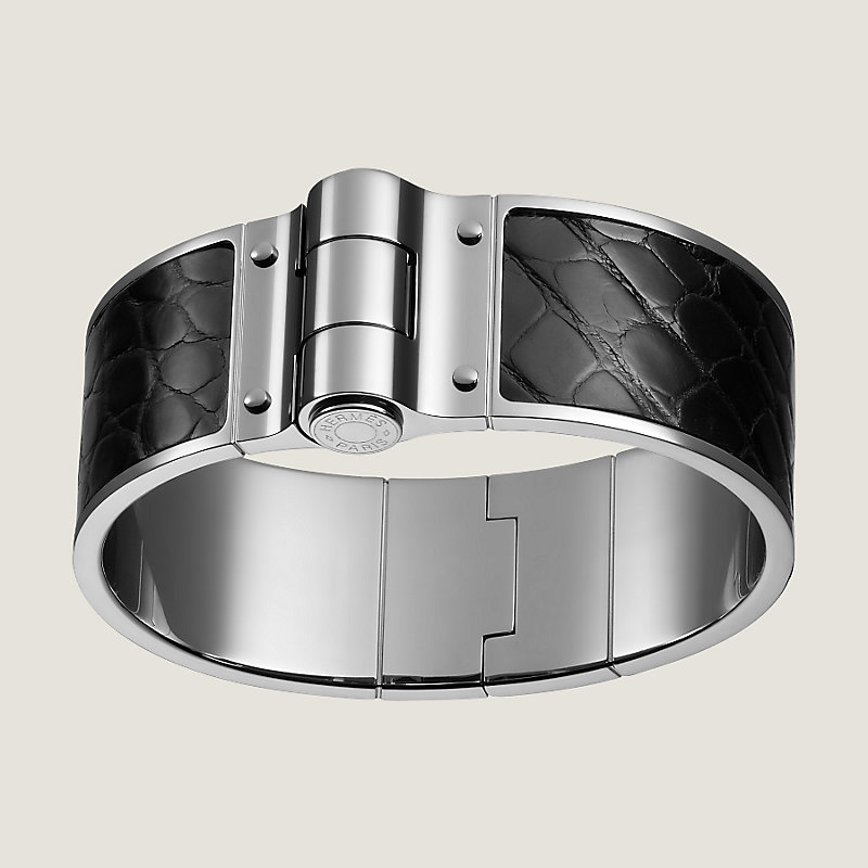 Wide bracelet in smooth Mississippiensis alligator leather. Palladium plated hardware