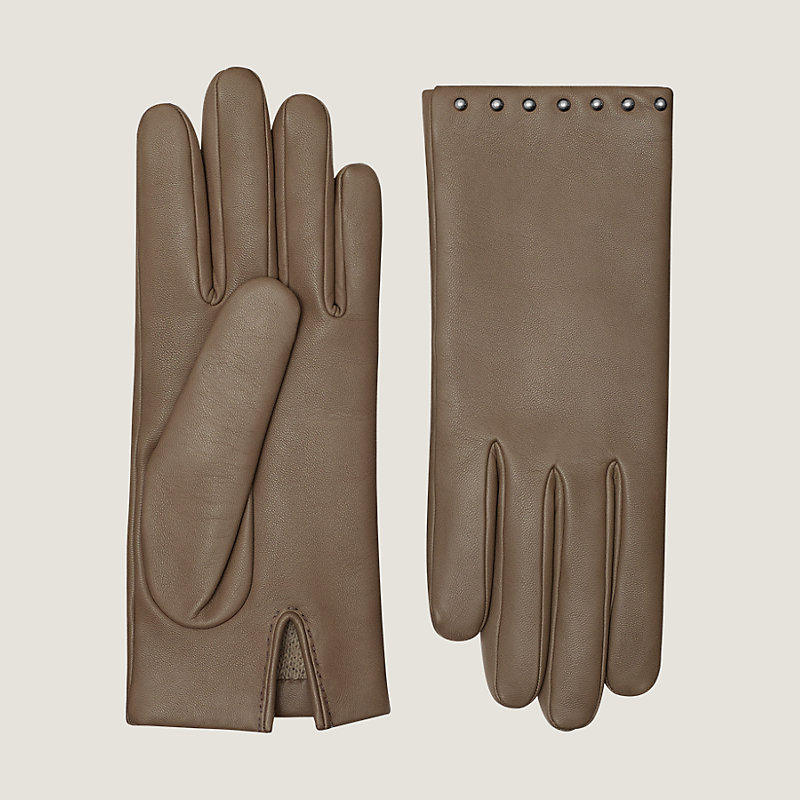 Hermes gloves in glossed lambskin with cashmere lining. Mini Dog finishings in palladium plated metal.