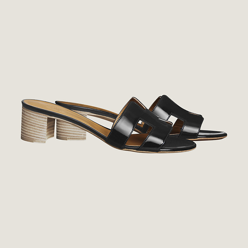 Hermes patent calfskin sandals with leather lining and insole, stacked heel with leather sole