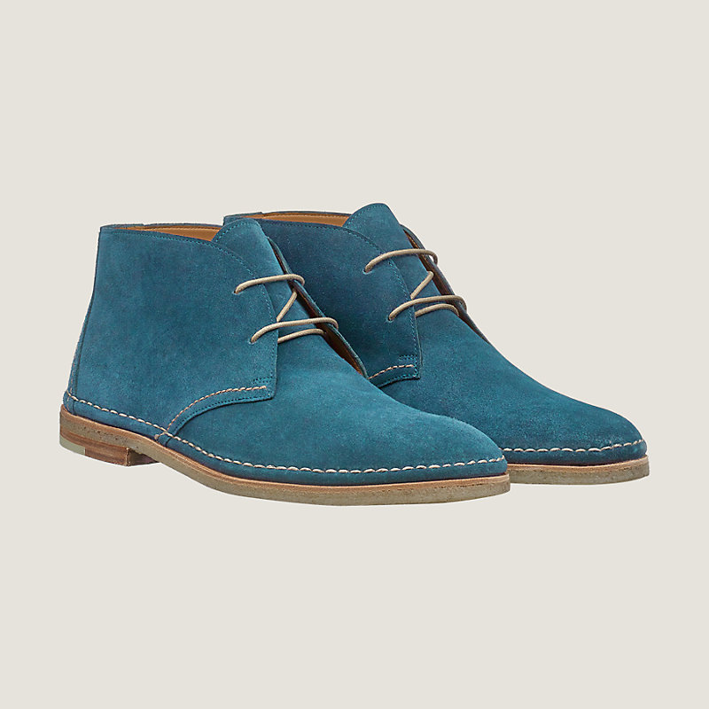 Hermes lace-up ankle boots in suede calfskin with hand-sewn contrasting stitching, palladium-plated mini Clou de Selle details and hand-stitched crepe sole