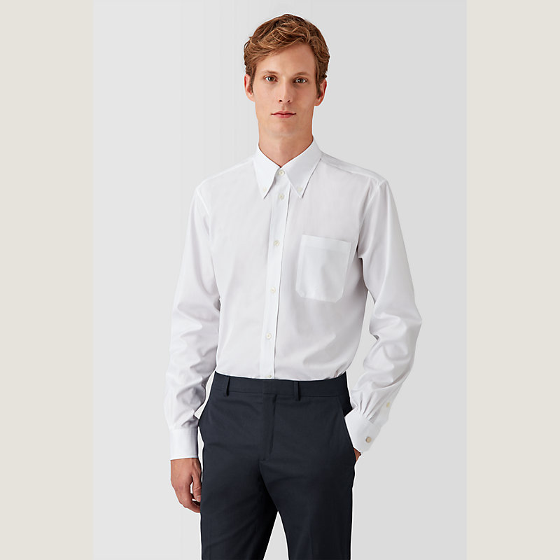 Our one-pocket pinpoint shirt with button-down collar. Straight body is tailored for comfort and timeless elegance. With pure mother of pearl buttons and box pleat placket. Barrel cuff with signature "Clou de Selle" button in palladium.