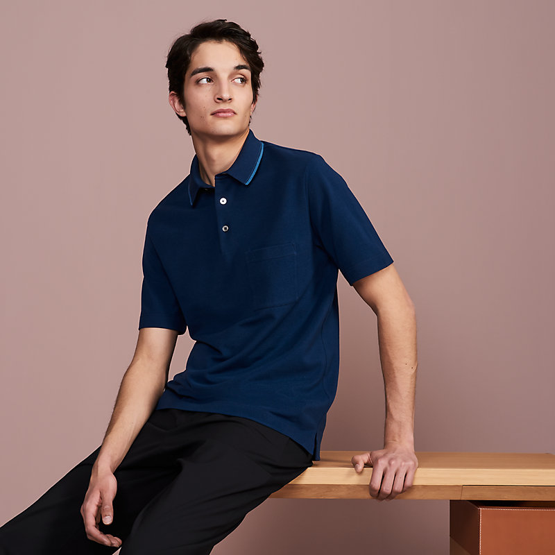 Polo shirt in cotton pique with contrasting striped collar with Sellier detail and a front pocket (100% cotton)