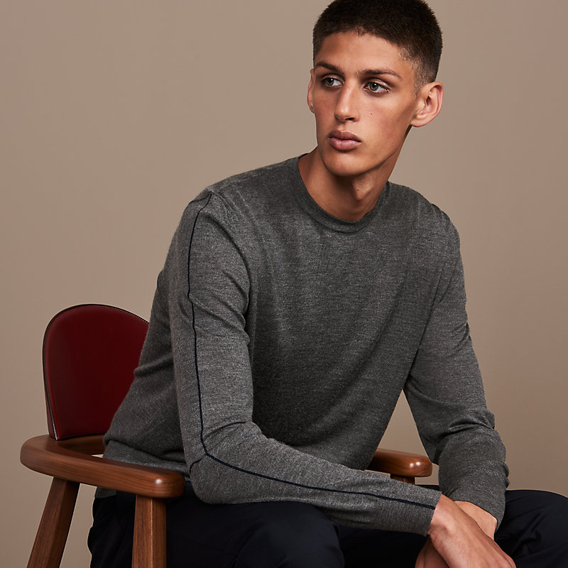 "Profil H" crewneck sweater in cashmere and silk with intarsia constrast and one gauge 18 thread (80% cashmere and 20% silk)