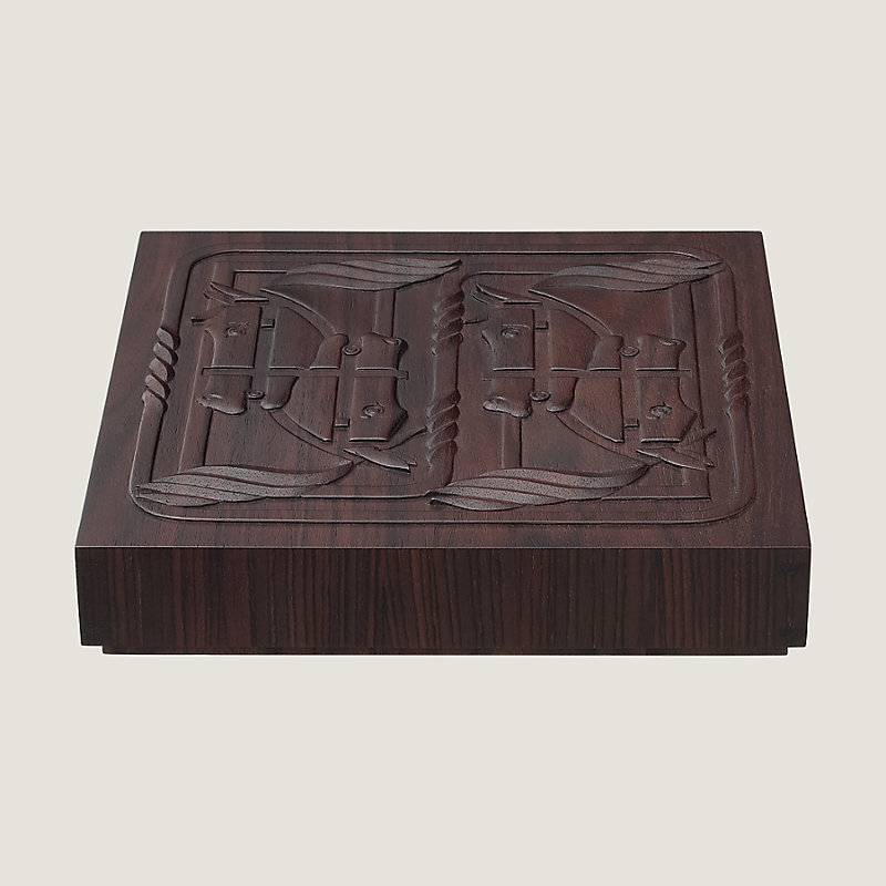 Hermes silk scarves box in solid palissander wood with hand engraved "Quadrige" pattern on top