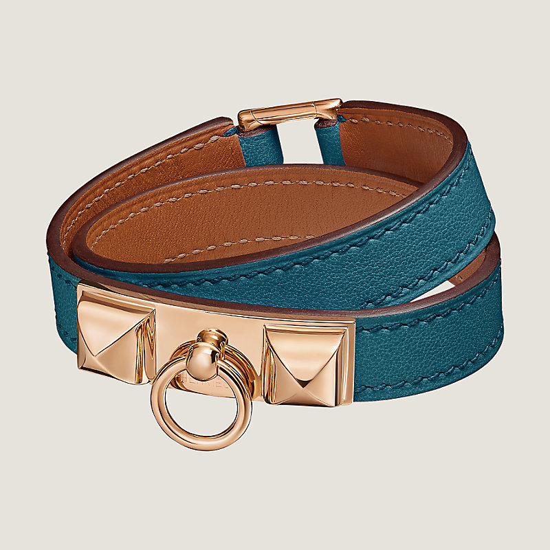 Double tour bracelet in Swift calfskin with rose gold plated Medor pyramid studs and ring