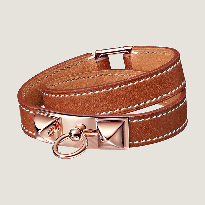 Double tour bracelet in Barenia calfskin with rose gold plated Medor pyramid studs and ring