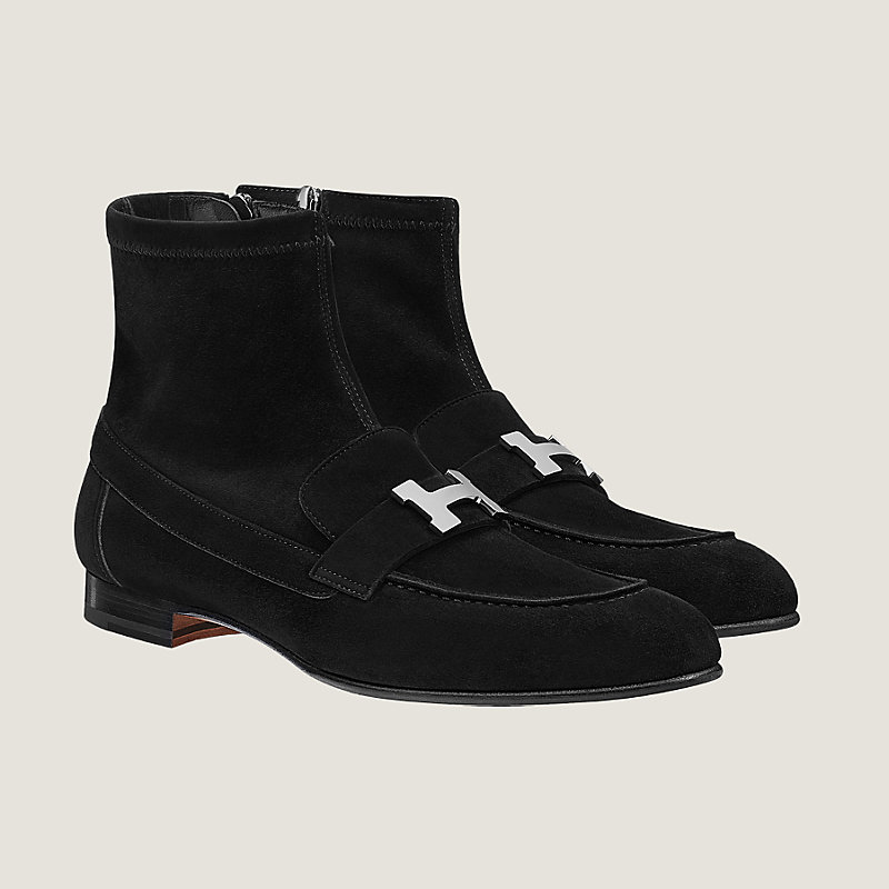 Ankle boot in stretch suede goatskin with palladium plated "H" detail, fitted at the ankle