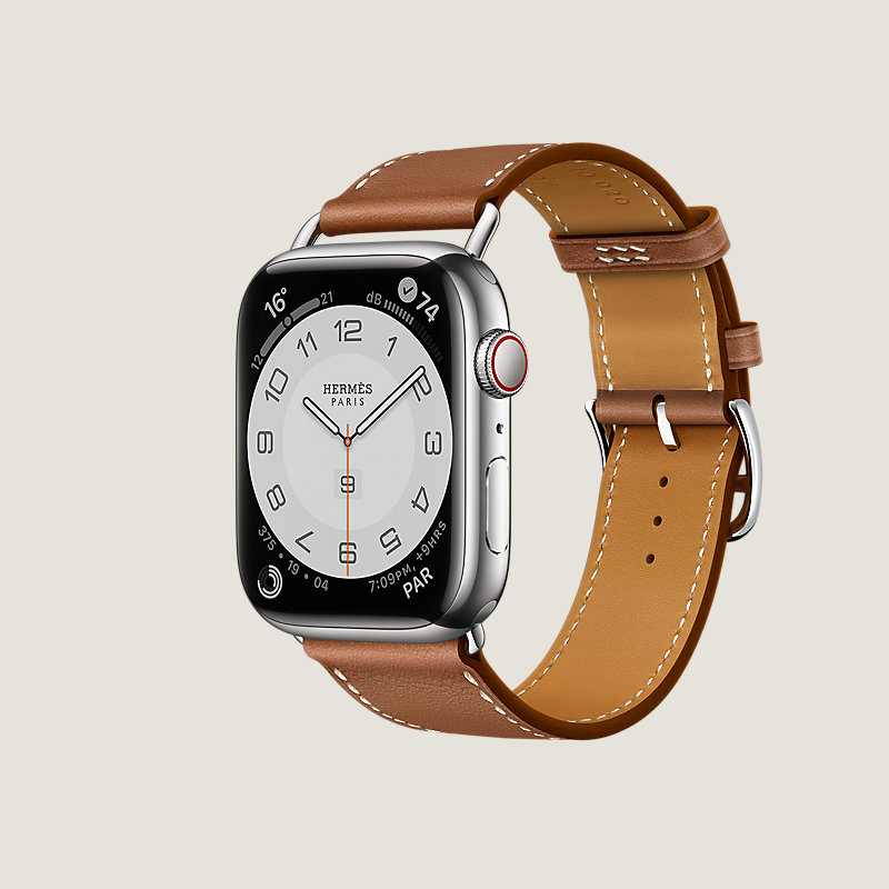 Apple Watch Hermès Series 8 case in stainless steel 45 mm & Single tour band in Gold Swift calfskin