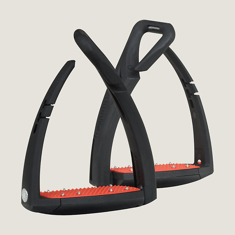 Hermes pair of stirrups in steel and thermoplastic polymer. "Hermes Sellier" Clou de Selle. The large inclined skid-proof tread provides balance and good positioning. The foot is released in case of fall.